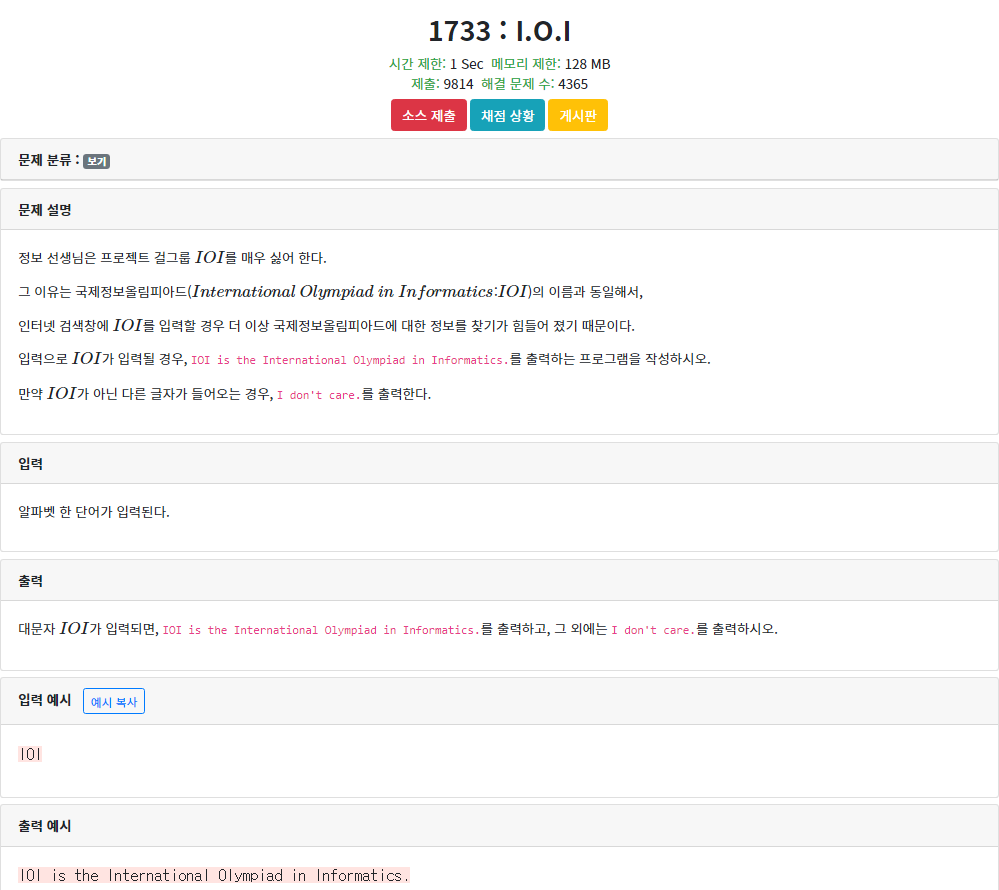 조건문을 사용하여 사용자가 입력한 문자가 'IOI' 에 해당하면 IOI is the International Olympiad in Informatics. 문자열을, 그 외의 다른 문자가 입력되면 I don't care. 를 출력한다.