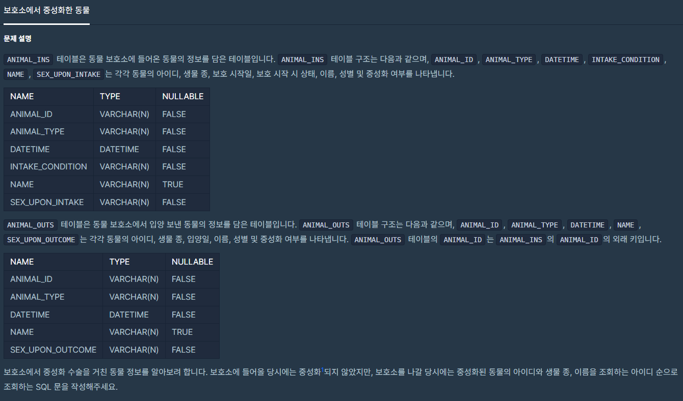 ANIMAL_INS 테이블은 동물 보호소에 들어온 동물의 정보를 담은 테이블이고, ANIMAL_OUTS 테이블은 동물 보호소에서 입양 보낸 동물의 정보를 담은 테이블이다.